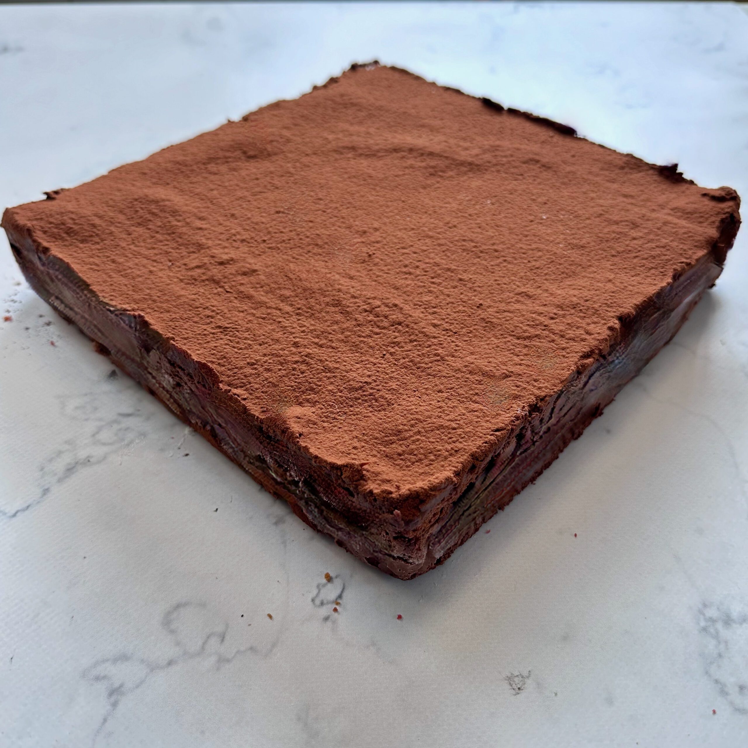 Een ware explosie bij elke hap van deze vegan chocoladetaart. Afgewerkt met een laagje pure chocolade ganache en cacao. Het pareltje van onze banketbakkers!